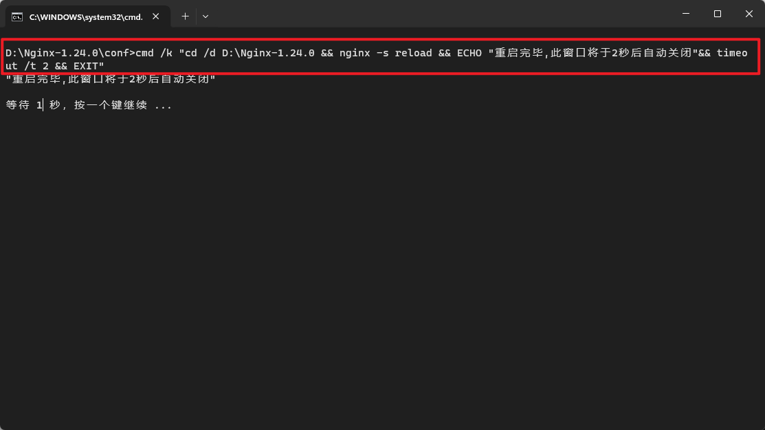 cmd /c "cd /d D:\Nginx-1.24.0 && nginx -s reload && ECHO "重启完毕,此窗口将于2秒后自动关闭"&& timeout /t 2"参数解释: