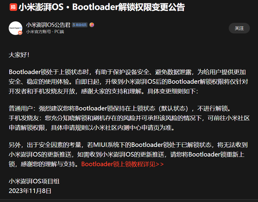 如果说一加作为国内刷机圈的二哥,逐步退出大众视野,影响并不算很大,但今天澎湃OS的一则通告,则是意味着国内刷机圈的大哥——小米或许也要跌落神坛。至此,国内刷机环境迎来至暗时刻。