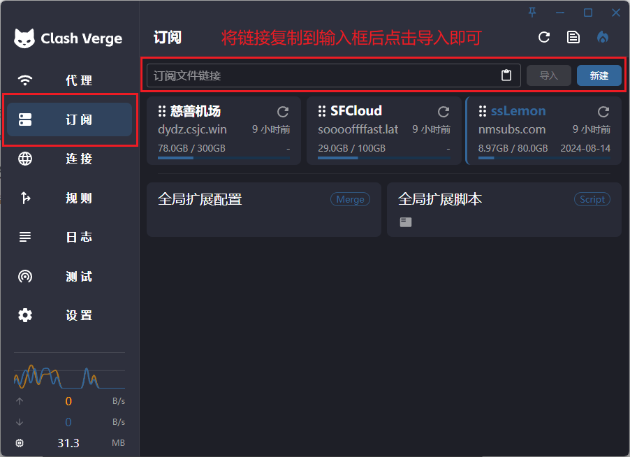 方式①:复制订阅地址后打开Clash Verge,打开代理列表,将订阅链接复制到输入框后点击导入即可。